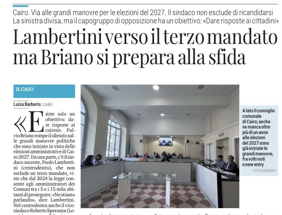 «Esiste solo un obiettivo: dare risposte ai cairesi». Fulvio Briano rompe il silenzio sulle grandi manovre politiche che sono iniziate in vista delle elezioni amministrative di Cairo 2027. Da una parte, c’è il sindaco uscente, Paolo Lambertini (centrodestra), che non esclude un terzo mandato, visto che dal 2024 la legge consente agli amministratori dei Comuni tra i 5 e i 15 mila abitanti di proseguire. «Ne stiamo parlando», dice Lambertini. Nel centrodestra anche il vicesindaco Roberto Speranza (Lega) è pronto candidarsi come numero uno e non ne fa mistero: «Credo sia legittimo pensare che, dopo tanti anni, il vice possa provarci. Ragioniamo in continuità sulla squadra attuale». Dall’altro schieramento c’è un centrosinistra che freme e, sotto l’egida del Pd, ha iniziato a convocare riunioni nella consapevolezza che, per vincere, bisogna creare una squadra unita. Nel 2022 il centrosinistra aveva espresso due liste, quella di Giorgia Ferrari (Cairo in Comune”) che dice: «In questo momento la priorità è concentrarci contro l’inceneritore, per scongiurare questa scellerata ipotesi di impianto a Cairo; valuteremo strada facendo se ci sarà un progetto comune. Siamo disponibili a collaborare con chi ha idee come le nostre». E quella di Fulvio Briano (Più Cairo). Ma le elezioni erano state vinte da Lambertini.