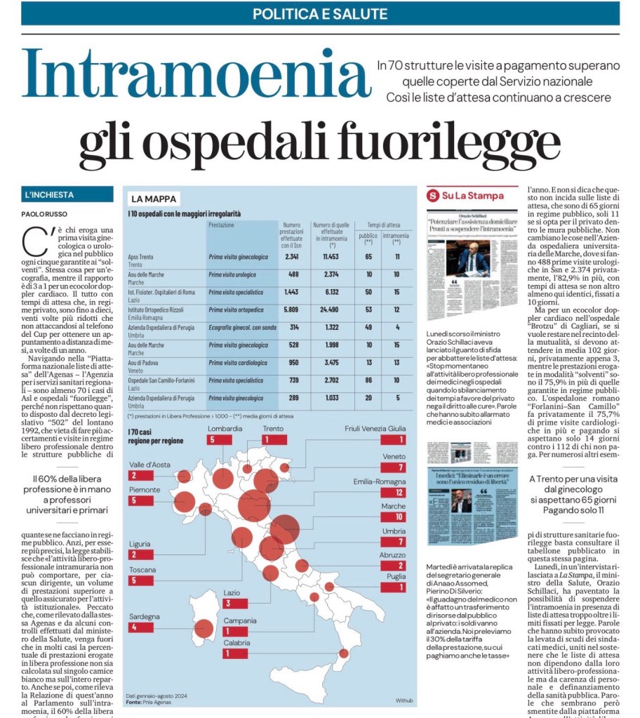 Navigando nella “Piattaforma nazionale liste di attesa” dell’Agenas – l’Agenzia per i servizi sanitari regionali – sono almeno 70 i casi di Asl e ospedali “fuorilegge”, perché non rispettano quanto disposto dal decreto legislativo “502” del lontano 1992, che vieta di fare più accertamenti e visite in regime libero professionale dentro le strutture pubbliche di quante se ne facciano in regime pubblico. Anzi, per essere più precisi, la legge stabilisce che «l’attività libero-professionale intramuraria non può comportare, per ciascun dirigente, un volume di prestazioni superiore a quello assicurato per l’attività istituzionale». Peccato che, come rilevato dalla stessa Agenas e da alcuni controlli effettuati dal ministero della Salute, venga fuori che in molti casi la percentuale di prestazioni erogate in libera professione non sia calcolata sul singolo camice bianco ma sull’intero reparto. Anche se poi, come rileva la Relazione di quest’anno al Parlamento sull’intramoenia, il 60% della libera professione la facciano i professori universitari e i primari. Coloro insomma che dovrebbero organizzare il lavoro nei reparti anche in funzione della riduzione delle liste di attesa, che ogni anno spingono quasi sei milioni di italiani a rinunciare alle cure e altri spendere una buona fetta di quei 40 miliardi di spesa sanitaria privata.