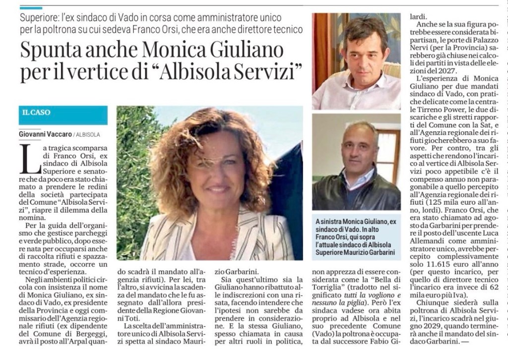 L’esperienza di Monica Giuliano per due mandati sindaco di Vado, con pratiche delicate come la centrale Tirreno Power, le due discariche e gli stretti rapporti del Comune con la Sat, e all’Agenzia regionale dei rifiuti giocherebbero a suo favore. Per contro, tra gli aspetti che rendono l’incarico al vertice di Albisola Servizi poco appetibile c’è il compenso annuo non paragonabile a quello percepito all’Agenzia regionale dei rifiuti (125 mila euro all’anno, lordi). Franco Orsi, che era stato chiamato ad agosto da Garbarini per prendere il posto dell’uscente Luca Allemandi come amministratore unico, avrebbe percepito complessivamente solo 11.615 euro all’anno (per questo incarico, per quello di direttore tecnico l’incarico era invece di 62 mila euro più Iva).