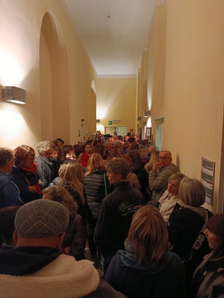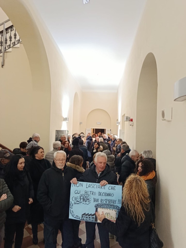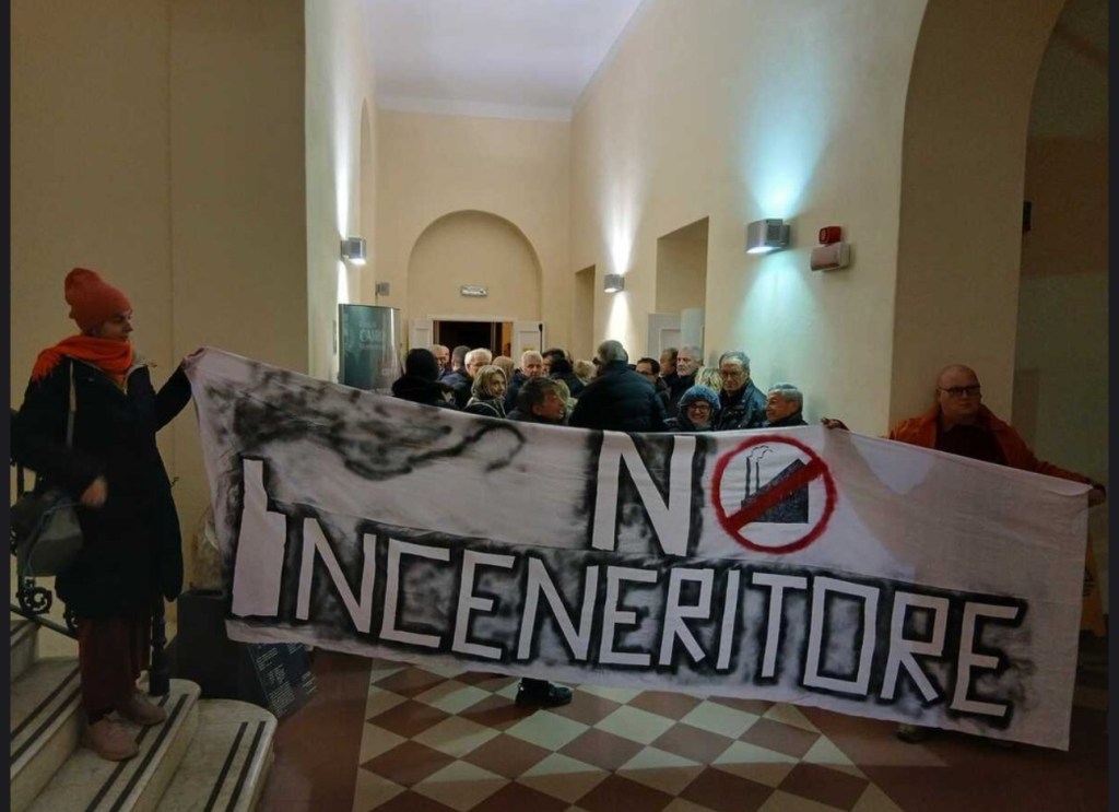 Una sala consiliare così gremita non si vedeva da anni: cittadini ovunque, corridoi pieni, cartelli e striscioni con un messaggio chiarissimo: “No inceneritore”.