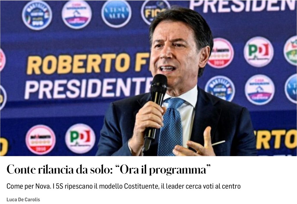 Da solo, ancora. Per provare a dare le carte nel campo largo tornato competitivo. E guadagnare spazio, al centro. Il giorno dopo la festa del centrosinistra in Campania, grazie innanzitutto al “suo” Roberto Fico, Giuseppe Conte – l’ex premier che troppo ex non si è mai sentito – lancia il cantiere per il programma del Movimento per le Politiche del 2027. “Un programma che serva davvero ai cittadini, alle famiglie, alle imprese, costruito dal basso” sostiene l’avvocato, citando come modello Nova, la costituente dell’anno scorso imperniata sulla consultazione degli iscritti.