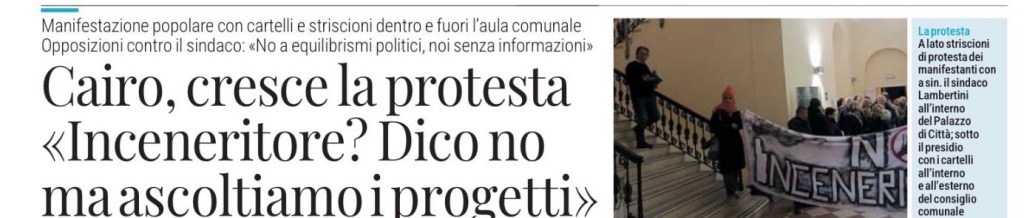 Sono solo alcuni dei cartelli che ieri sera i cairesi hanno portato in piazza per bocciare il progetto di accogliere un termovalorizzatore in valle. Incuranti del freddo e dell’orario, più di cento persone si sono date appuntamento fuori dal Municipio e hanno affollato i corridoi di Palazzo di Città, visto che la sala consiglio era troppo piccola per accoglierli. La fotografia della piazza è stata un chiaro indicatore del “no” degli abitanti e di quanto il tema sia sentito.