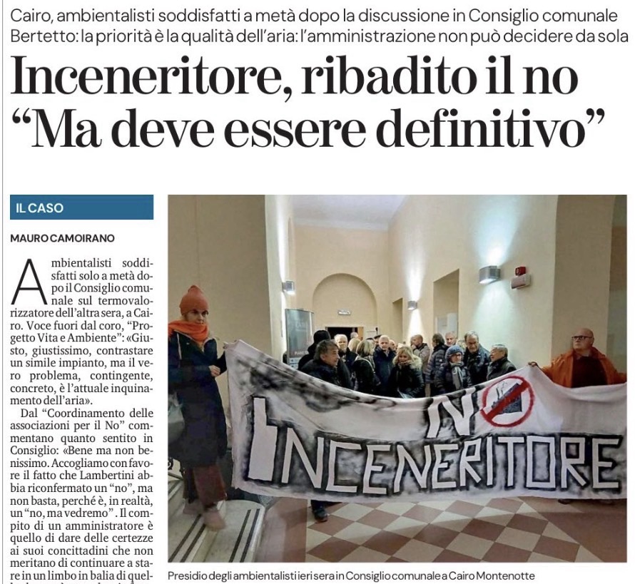 CAIRO, AMBIENTALISTI SODDISFATTI A METÀ DOPO LA DISCUSSIONE IN CONSIGLIO COMUNALE BERTETTO: LA PRIORITÀ È LA QUALITÀ DELL’ARIA: L’AMMINISTRAZIONE NON PUÒ DECIDERE DA SOLA