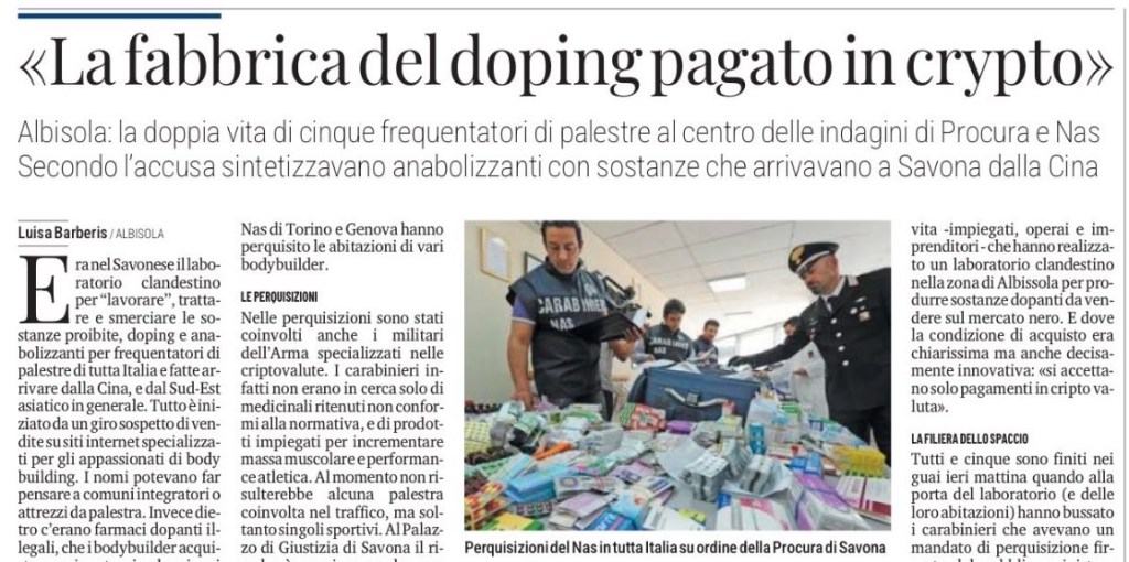 Era nel savonese il laboratorio clandestino per “lavorare”, trattare e smerciare le sostanze proibite, doping e anabolizzanti per frequentatori di palestre di tutta Italia e che arrivavano dalla Cina, dal Sud-Est asiatico in generale. Tutto è descritto da un grosso spettro di vendite su siti internet specializzati e già appassionati di body building. I nomi potevano far pensare a comuni integratori o attrezzi da palestra. Invece dietro c’erano farmaci dopanti illegali, che i body builder acquistavano in rete e in alcuni casi pagavano persino con criptovalute per non farsi tracciare.
