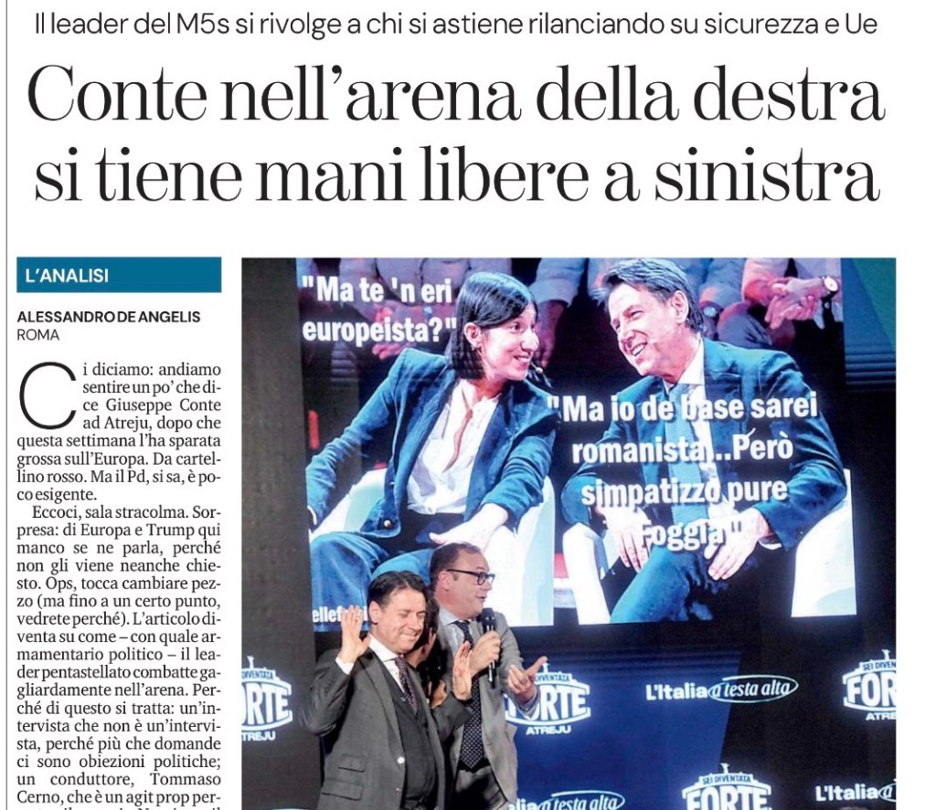 Ci diciamo: andiamo sentire un po’ che dice Giuseppe Conte ad Atreju, dopo che questa settimana l’ha sparata grossa sull’Europa. Da cartellino rosso. Ma il Pd, si sa, è poco esigente.