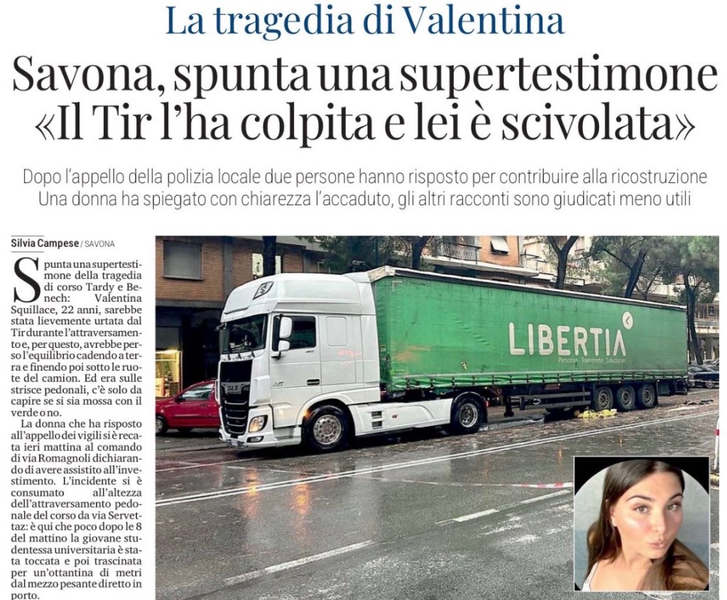 Spunta una supertestimone della tragedia di corso Tardy e Benech: Valentina Squillace, 22 anni, sarebbe stata lievemente urtata dal Tir durante l’attraversamento e, per questo, avrebbe perso l’equilibrio cadendo a terra e finendo poi sotto le ruote del camion. Ed era sulle strisce pedonali, c’è solo da capire se si sia mossa con il verde o no.