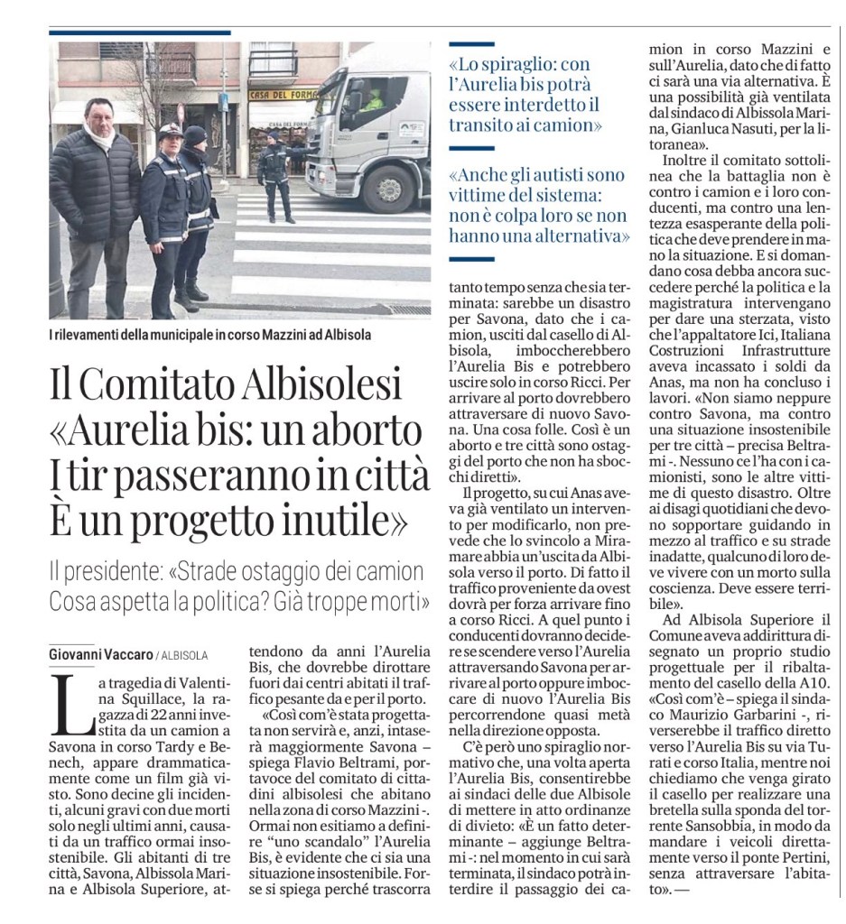 La tragedia di Valentina Squillace, la ragazza di 22 anni investita da un camion a Savona in corso Tardy e Benech, appare drammaticamente come un film già visto. Sono decine gli incidenti, alcuni gravi con due morti solo negli ultimi anni, causati da un traffico ormai insostenibile. Gli abitanti di tre città, Savona, Albissola Marina e Albisola Superiore, attendono da anni l’Aurelia Bis, che dovrebbe dirottare fuori dai centri abitati il traffico pesante da e per il porto.
