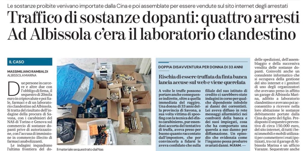 Due persone in carcere e altre due con l’obbligo di firma, il sequestro di 20mila euro in criptovalute e poi fiale, farmaci e di un laboratorio clandestino ad Albissola. Si tratta del risultato dell’indagine della procura di Savona, con i carabinieri del NAS di Torino e Genova sul commercio di sostanze dopanti prive di autorizzazione, con l’accusa di immissione in commercio illecito di farmaci anabolizzanti.