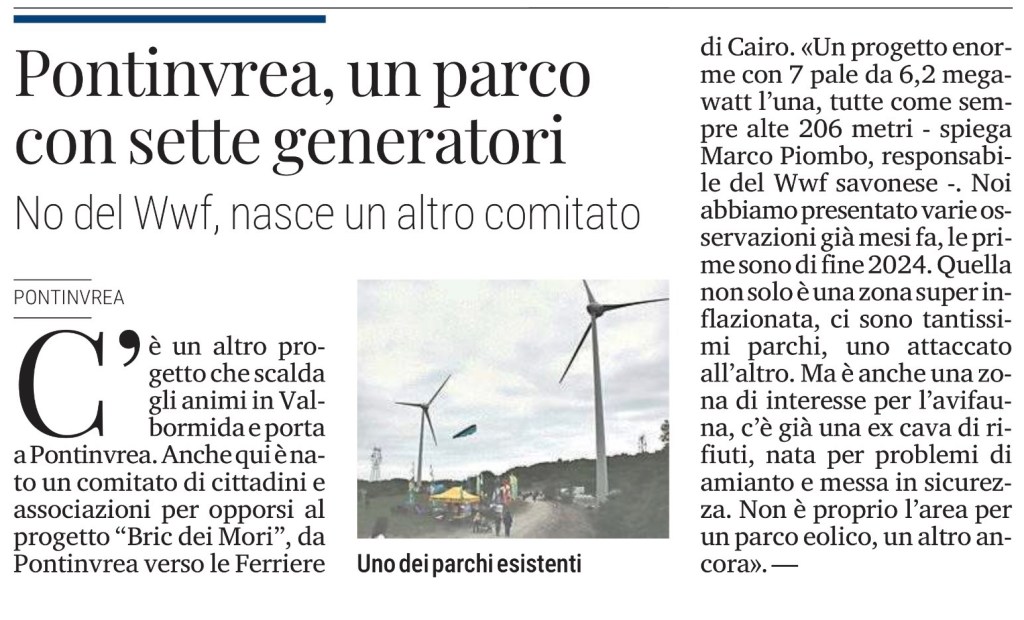 C’è un altro progetto che scalda gli animi in Valbormida e porta a Pontinvrea. Anche qui è nato un comitato di cittadini e associazioni per opporsi al progetto “Bric dei Mori”, da Pontinvrea verso le Ferriere di Cairo. «Un progetto enorme con 7 pale da 6,2 megawatt l’una, tutte come sempre alte 206 metri – spiega Marco Piombo, responsabile del Wwf savonese -. Noi abbiamo presentato varie osservazioni già mesi fa, le prime sono di fine 2024. Quella non solo è una zona super inflazionata, ci sono tantissimi parchi, uno attaccato all’altro. Ma è anche una zona di interesse per l’avifauna, c’è già una ex cava di rifiuti, nata per problemi di amianto e messa in sicurezza. Non è proprio l’area per un parco eolico, un altro ancora». —