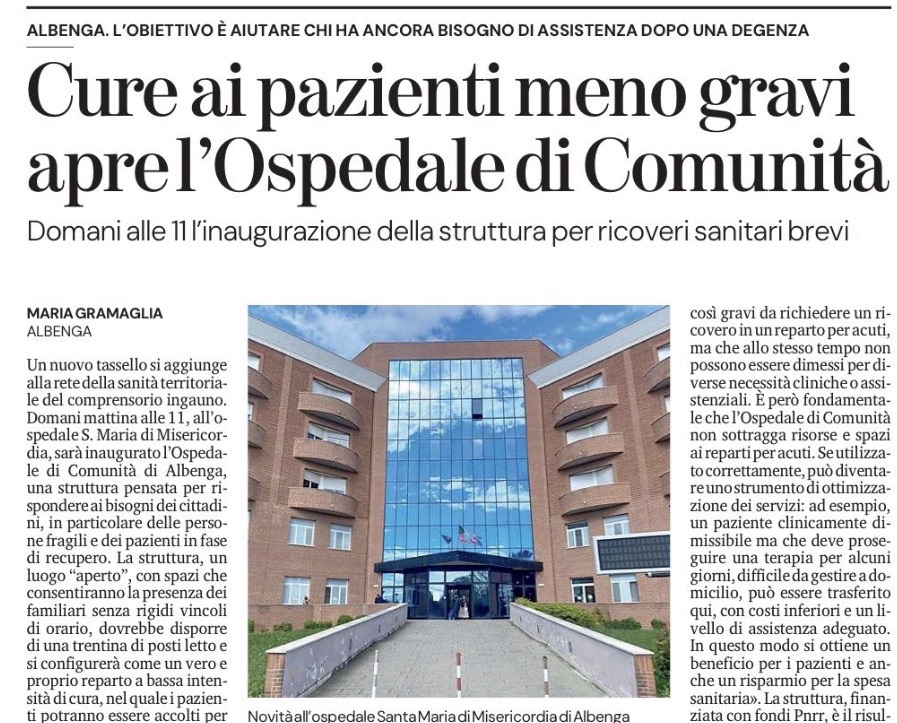 Un nuovo tassello si aggiunge alla rete della sanità territoriale del comprensorio ingauno. Domani mattina alle 11, all’ospedale S. Maria di Misericordia, sarà inaugurato l’Ospedale di Comunità di Albenga, una struttura pensata per rispondere ai bisogni dei cittadini, in particolare delle persone fragili e dei pazienti in fase di recupero. La struttura, un luogo “aperto”, con spazi che consentiranno la presenza dei familiari senza rigidi vincoli di orario, dovrebbe disporre di una trentina di posti letto e si configurerà come un vero e proprio reparto a bassa intensità di cura, nel quale i pazienti potranno essere accolti per periodi di ricovero breve.