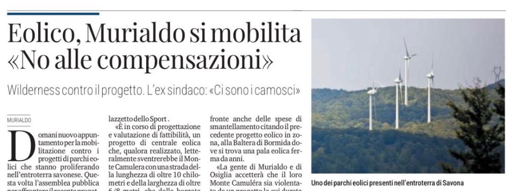 Domani nuovo appuntamento per la mobilitazione contro i progetti di parchi eolici che stanno proliferando nell’entroterra savonese. Questa volta l’assemblea pubblica per affrontare il recente progetto ” Monte Camulera” si terrà a Murialdo. Comune interessato insieme ad Osiglia dall’ultimo progetto finito all’attenzione dell’opinione pubblica e su cui l’associazione ambientalista Wilderness di Murialdo, presieduta da Franco Zunino, ha annunciato ieri di aver depositato le osservazioni contrarie.