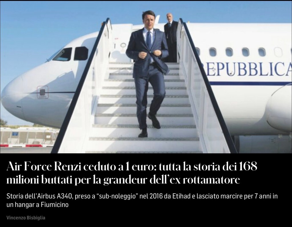 La Procura di Civitavecchia aveva archiviato lo stralcio penale e le motivazioni, senza indagati, restano riservate. La Corte dei Conti non risulta abbia mai concluso la sua istruttoria. E poi c’è lo Stato, che come svelato dal Corriere, regala la carcassa dell’Airbus agli ex commissari Alitalia alla cifra simbolica di 1 euro, dopo averci investito almeno 168 milioni. Finisce in cavalleria la storia dell’“Air Force Renzi”, l’aereo governativo da 300 posti preso a “sub-noleggio” nel 2016 da Etihad – già socia al 49% di Alitalia – e fatto volare solo 88 volte in 2 anni, alla media di 23 passeggeri per volta.