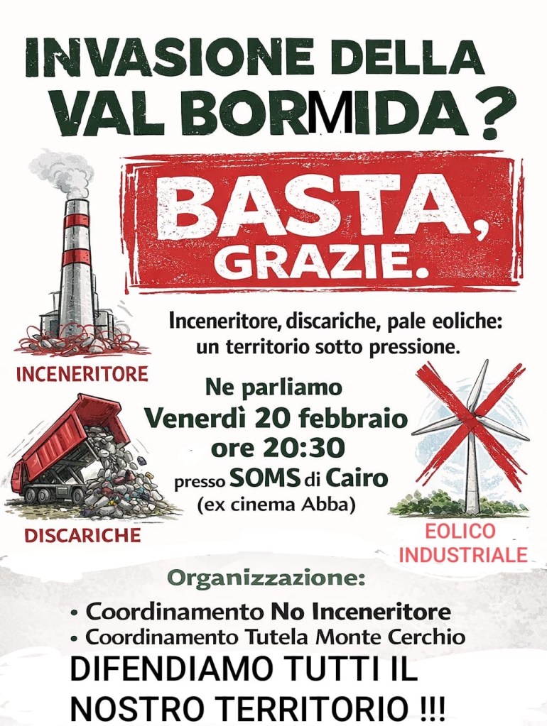 Il tema dell’eolico nel Savonese sarà al centro della nuova assemblea pubblica in programma venerdì 20 febbraio alle 20.30 alla sala SOMS di Cairo Montenotte, occasione per fare il punto anche sulla questione inceneritore.