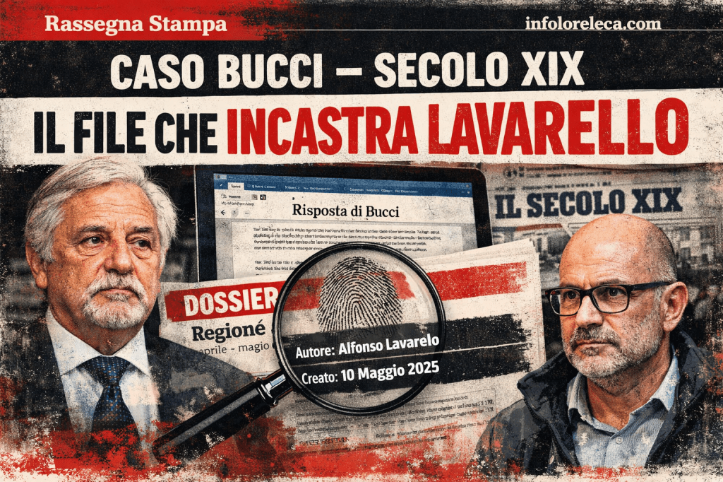Secondo l’articolo, il file Word originale di quel documento sarebbe stato prodotto sul computer di Alfonso Lavarello, figura considerata vicina agli interessi dell’editore del quotidiano, Gianluigi Aponte. Non solo: nel testo comparirebbero riferimenti letterali al dossier “aprile-maggio 2025 Uff. stampa Regione”, cioè uno dei report che il portavoce di Marco Bucci, Federico Casabella, avrebbe rivendicato davanti all’Ordine dei giornalisti.