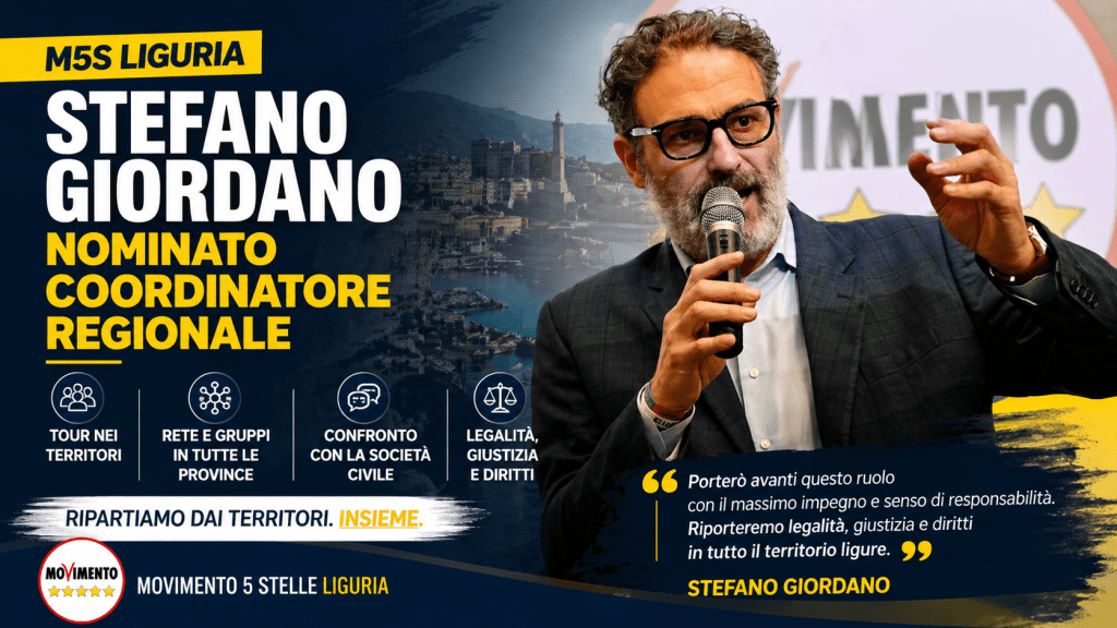 Genova, 28 aprile 2026 – Stefano Giordano, capogruppo del MoVimento 5 Stelle in Regione Liguria, è stato nominato nuovo coordinatore regionale del M5S.